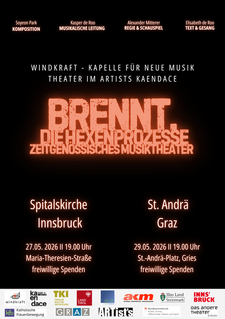 "BRENNT." verbindet historische Dokumente, dramatischen Dialog und Musik. Zeitgenössische Kompositionen der Grazer Komponistin Soyeon Park treffen auf Fragmente des romantischen Kunstlieds, interpretiert vom Ensemble Windkraft – Kapelle für Neue Musik. Alexander Mitterer leiht seine Stimme dem Inquisitor. Elisabeth de Roo übernimmt die Rolle der Frau. Die Musik öffnet emotionale Räume, in denen Kramers Sprache brüchig wird und eine andere Stimme hörbar wird.